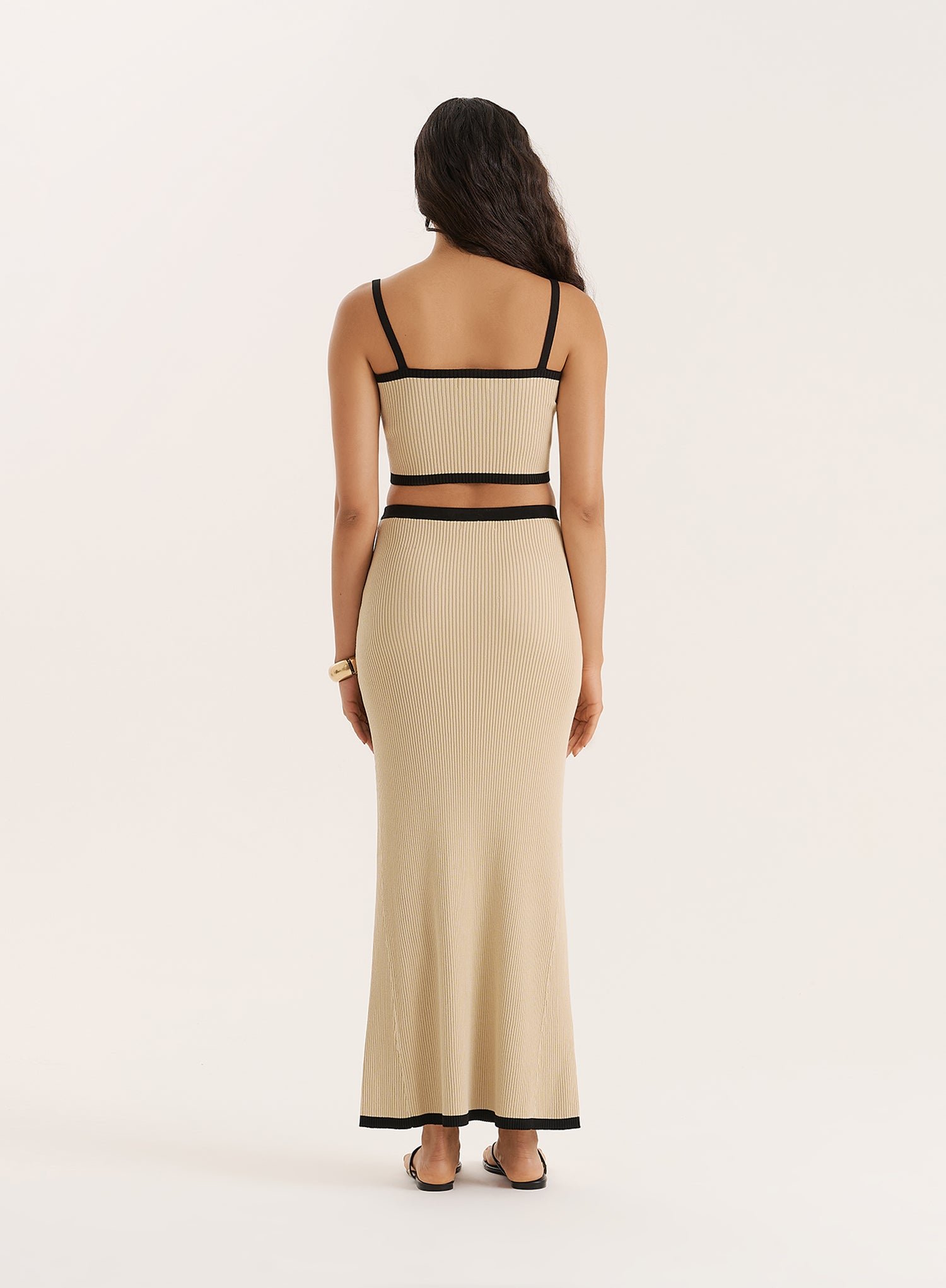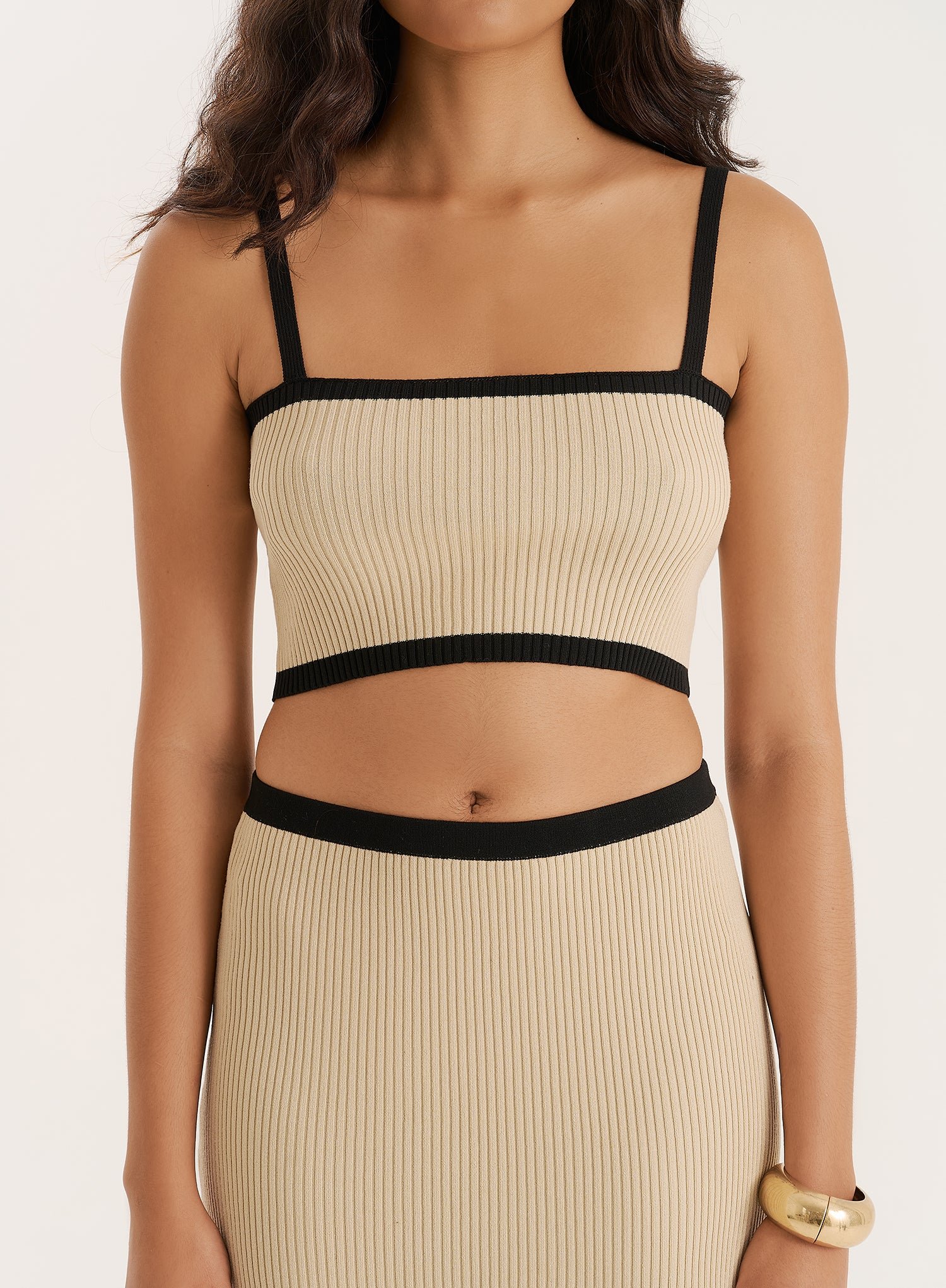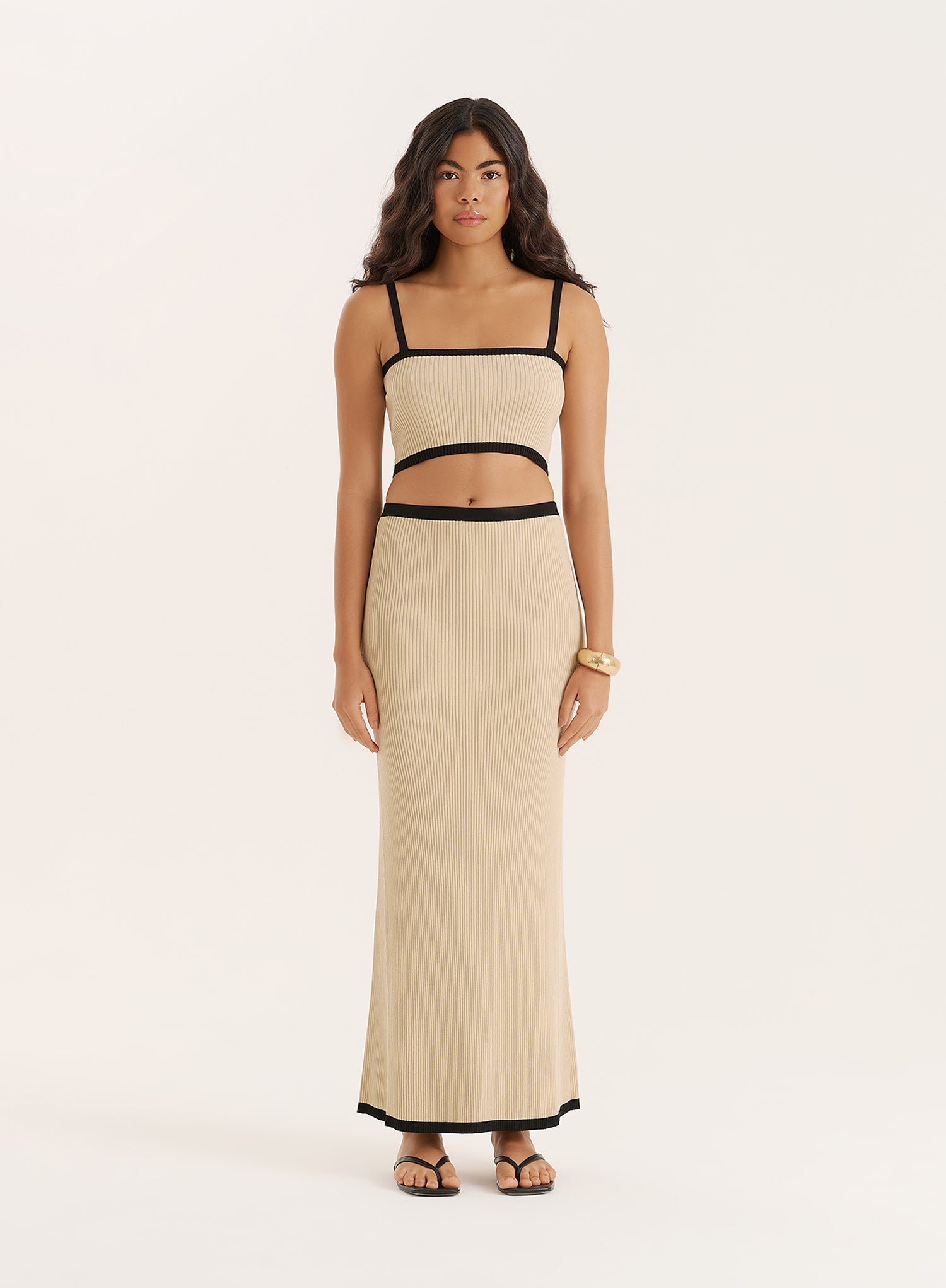 In a gorgeous summer knit, the Colette crop top comes in a minimalist, square neck design for a super versatile fit. Featuring thin straps, the ecru fabric is offset with a contrast black trim. Pair with the matching maxi skirt for a summer co-ord look that will see you through your last summer plans and beyond.