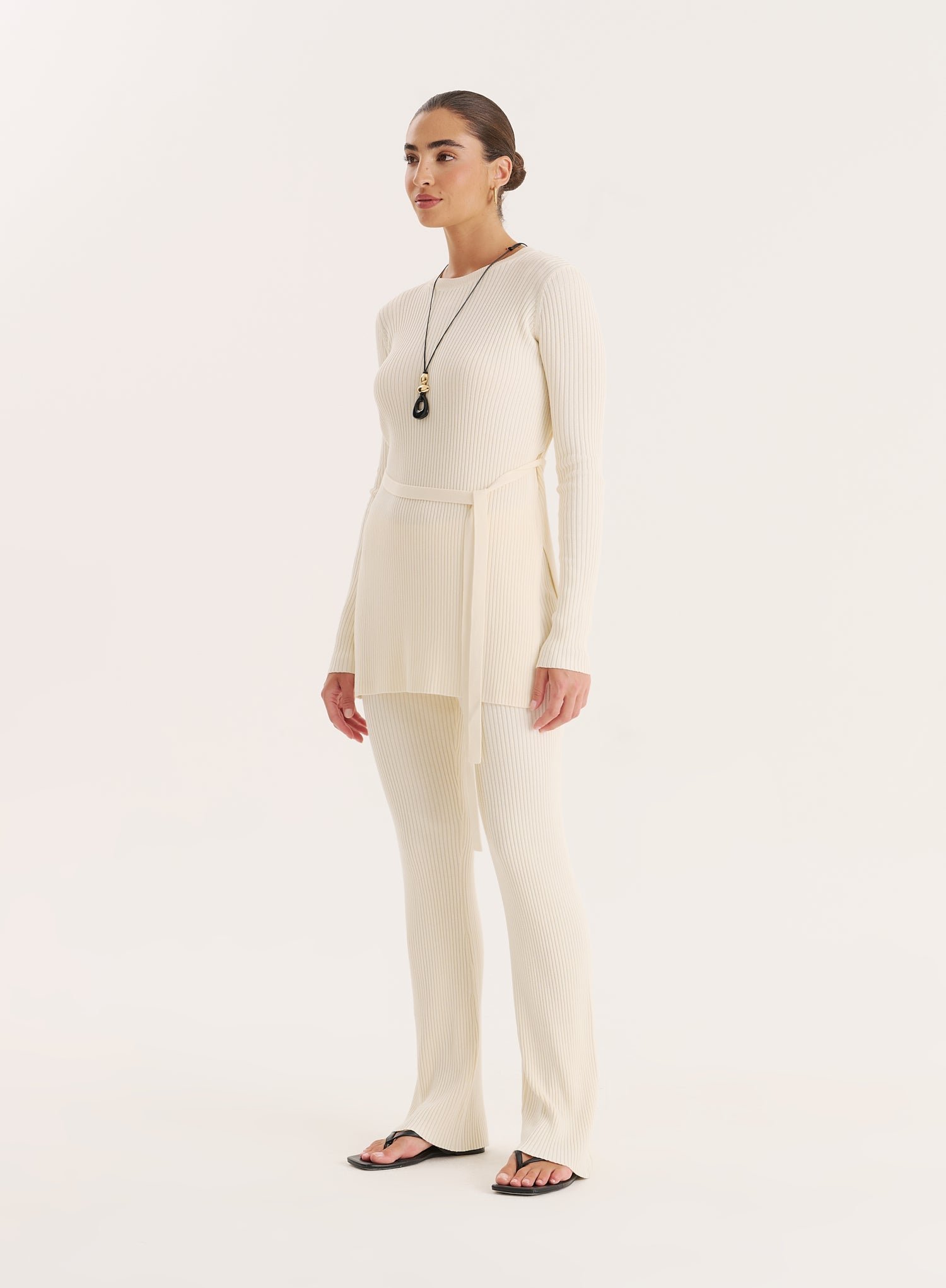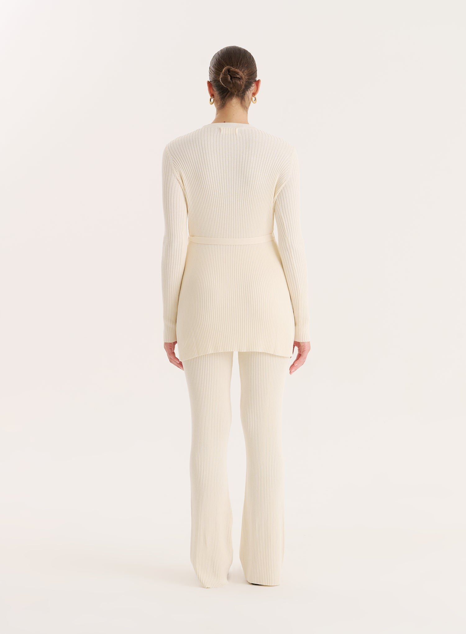 Crafted from a soft ribbed knit fabric, the cream Louie top is the perfect transitional piece to style from day to evening. In a longline, regular fit, it features long sleeves and a round neckline for timeless appeal, whilst the tonal tie belt at the waist creates shape and detail. Wear with the matching Louie trousers for the perfect autumnal co-ord.