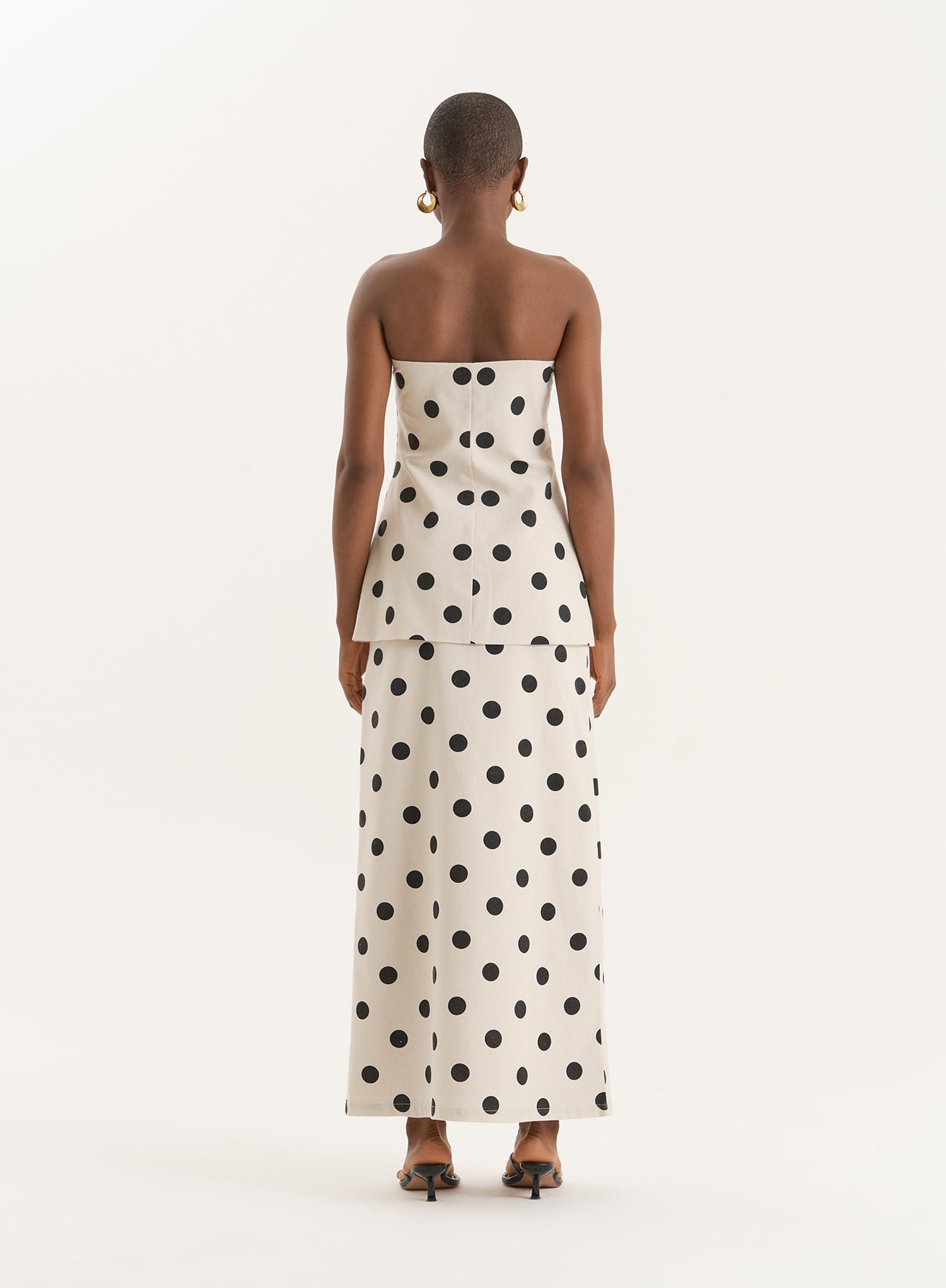 For summer soire??s and beyond, the Clementine polka dot top is your new go-to piece for all occasions. Made from a gorgeous printed linen fabric, it sits at a longline length with tailored seam details and a bandeau neckline for a flattering, slimming fit. Wear it with the matching maxi skirt for everything from holiday evenings to wedding season.