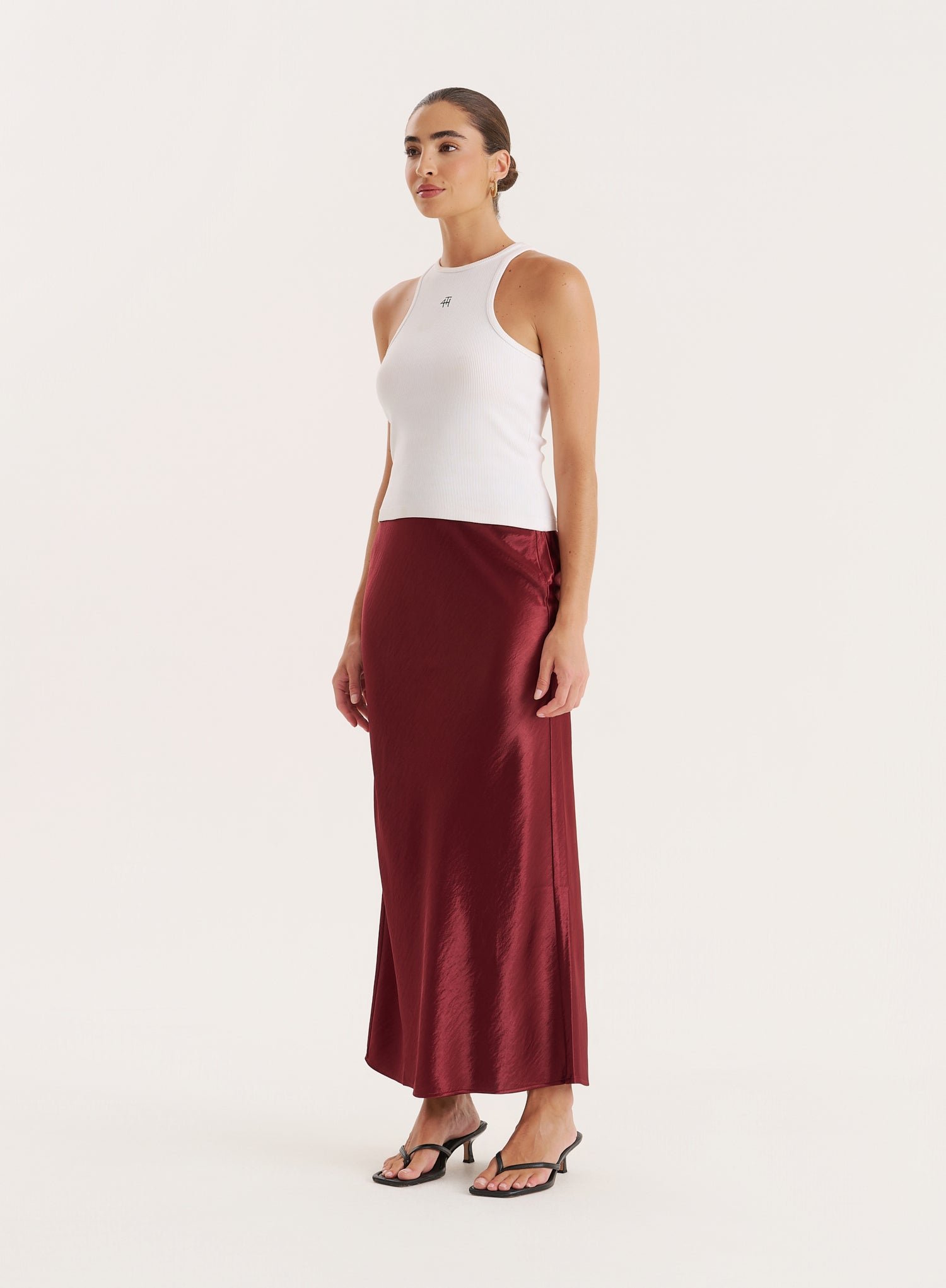 Cut to a flattering midaxi length, the Novah satin skirt is the ultimate wardrobe essential for trans-seasonal dressing. In a body skimming, straight silhouette, it’s updated in a rich burgundy hue that’s perfect for autumnal styling. Style it back with our everyday vests or chunky knits for versatile everyday wear.