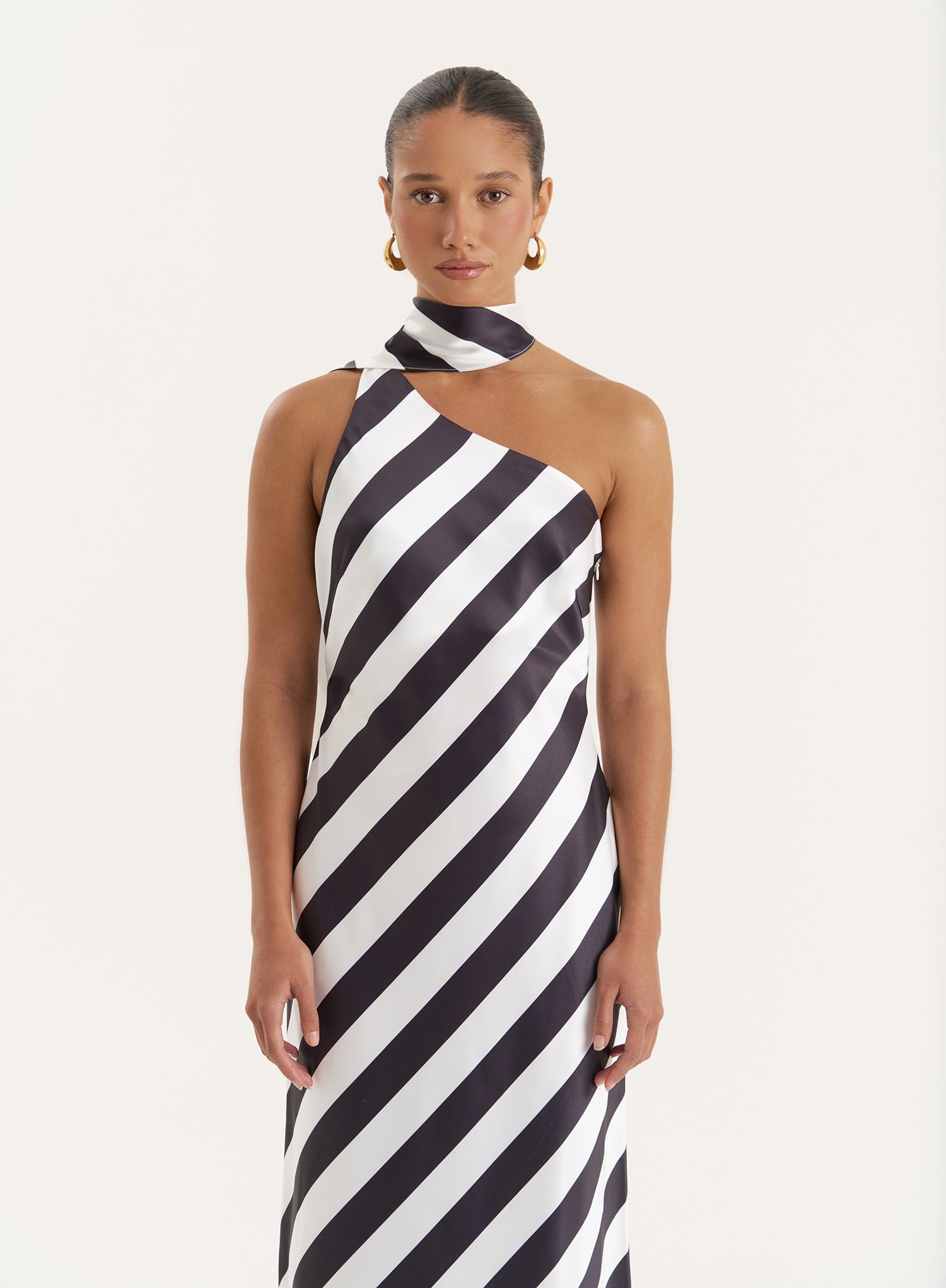 We’re ready for occasion season in the Ellen dress. In a striking stripe print, the satin maxi dress is the ultimate occasion wear piece for abroad weddings, summer soire??s and so much more. With an asymmetric, one shoulder neckline, it features a draped scarf detail that falls down the back, with a thin strap for additional support. A body skimming, flattering fit, simply slip on with heels and understated jewellery.