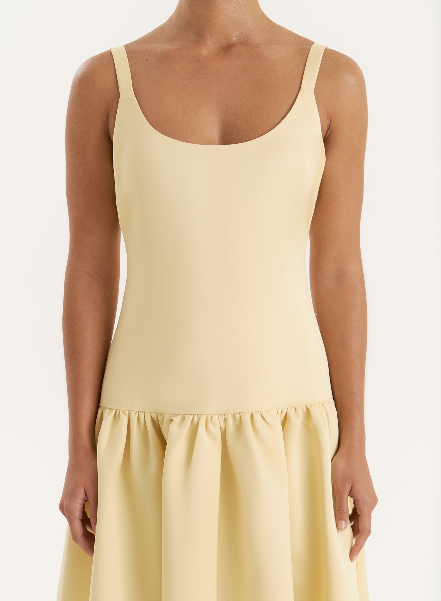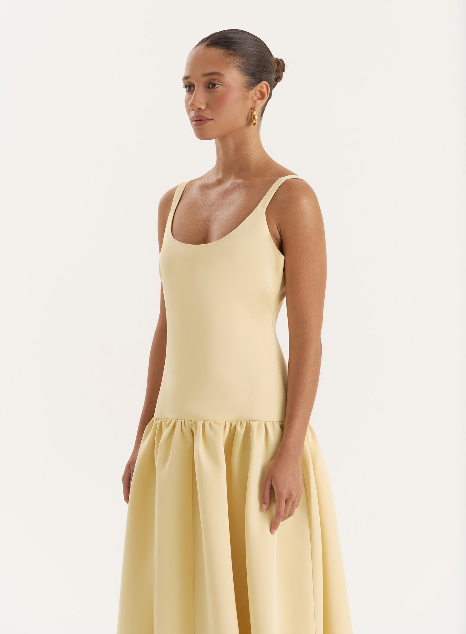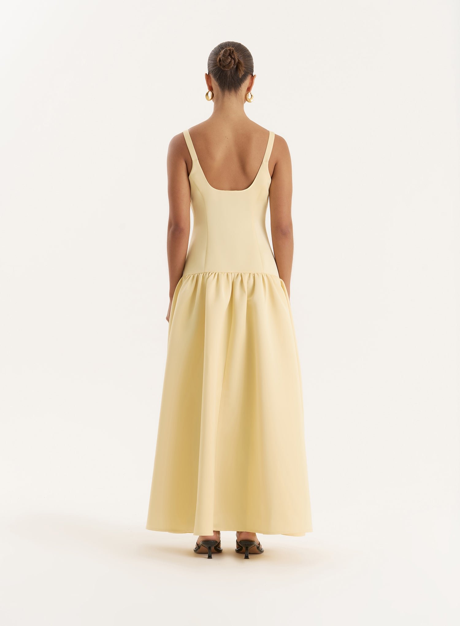 A 4th favourite for occasion season and beyond, welcome the Melinie maxi dress to your summer collection. A truly stunning piece in a trending pale yellow, it features a drop waist design with a statement volume skirt, offset with a fitted bodice, scooped neckline and low back detailing. Made from a heavyweight satin for a luxurious, tailored fit, it’s the ultimate special occasion piece for wedding guests, evening soire??s and so much more. Style it with understated accessories and let the dress have its moment.